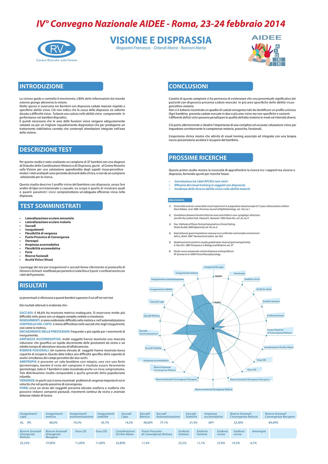 Questo studio descrive il profilo visivo del bambino con disprassia, senza fare analisi di tipo correlazionale o causale. Lo scopo è quello di mostrare quali e quanti parametri visivi compromettono un’adeguata efficienza visiva nella disprassia.